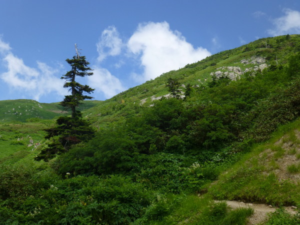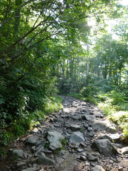 ブナの樹林帯。登り始めたらワクワクしてる。 暑くなる前に高度を稼ぎたい。 8:00 中飯場(なかはんば)到着。いいペースだ。