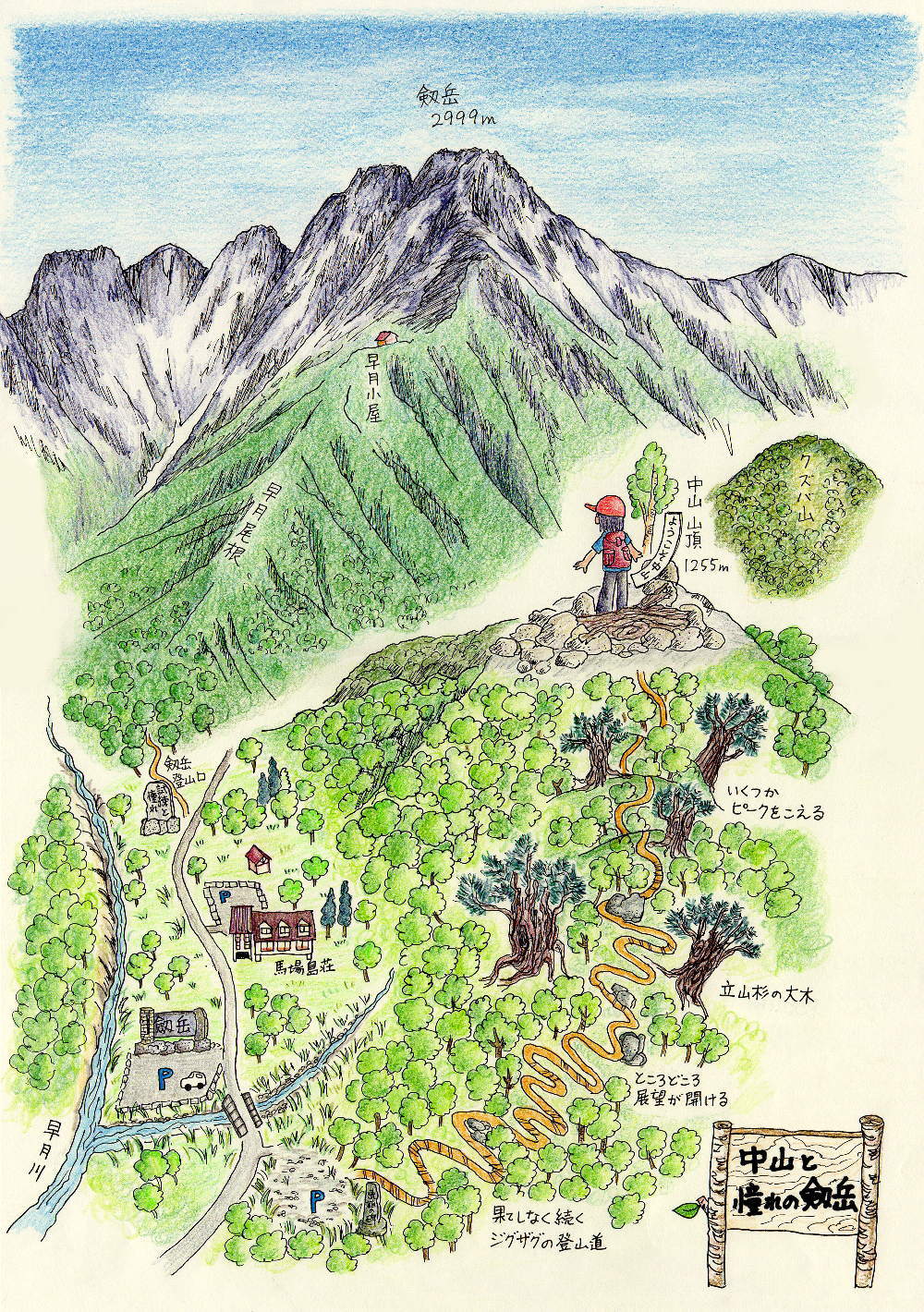 ※ 登山道をたどって上へスクロールしてご覧ください。 ※ イラストの方角・配置・山形などはイメージです。デフォルメも有り。 ※ 画像の使用には御一報ください。